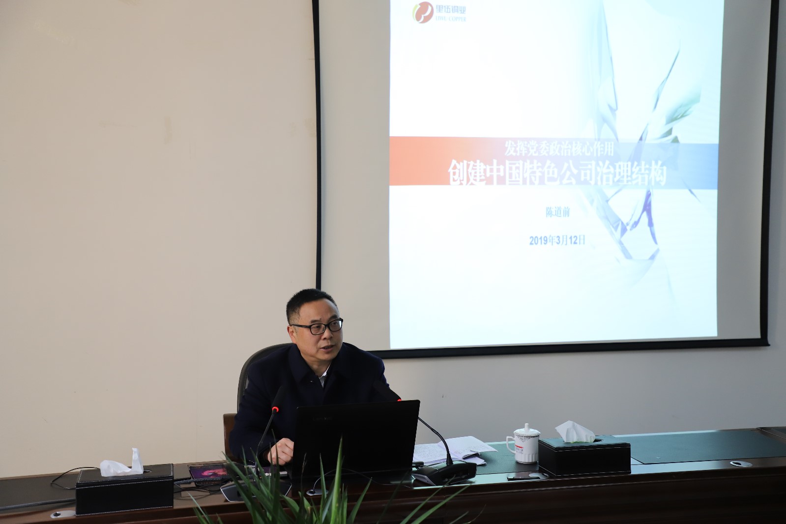 陈道前书记着重与大家分享了自己对新时期如何做好企业党建工作的探究与深度思考。他根据公司的历史沿革,股权结构、治理现状等,总结分析了公司党组织的职能定位、履职的主要内容和履职的主要途径。他认为,里伍铜业公司是典型的国有资本实际控制的混合所有制企业,党组织的主要职能一是加强自身建设;二是加强政治领导和思想领导;三是通过“参与决策、主导用人、纪律监督、带头执行、群众工作”实现参与公司治理。
